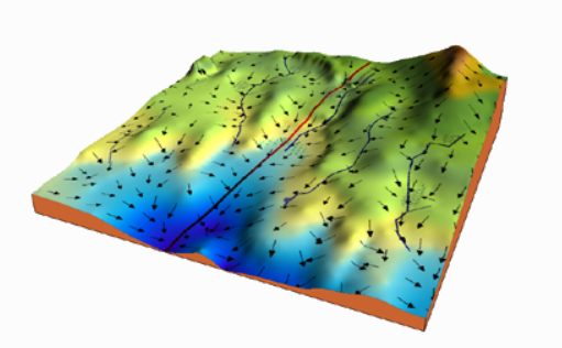 다음과 같이 3차원 그래프 그림이 있다고 가정을 해볼게요. 여기서 우리가 원하는 것은 오른쪽 위에보이는 높은 지형(높은 값을 가진 지형이라고 가정할게요) 에서 가장 낮은 지형(진한 파랑 -> 낮은 값을 가지고 있는 지형)으로 가고자 하는 것으로 하겠습니다. 그리고 그림에서 화살표는 해당 위치에서 음의 기울기방향(높은 지형에서 낮은 지형)으로 그려져 있는 형태입니다.